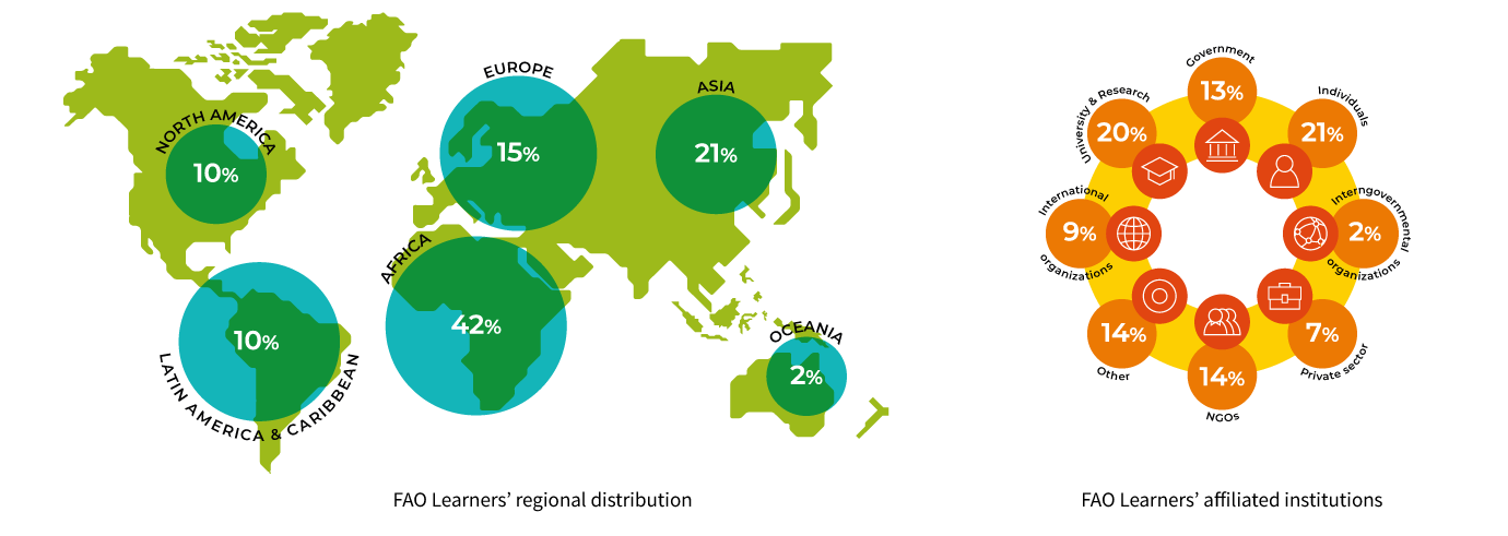 The FAO elearning Academy offers free access to content on a variety of topics of global interest, which is available in a range of formats, including elearning courses for self-paced learning, blended learning programmes, massive open online courses (MOOCs), technical webinars, online tutored courses, mobile learning, face-to-face training workshops and university master’s and postgraduate degree programmes.